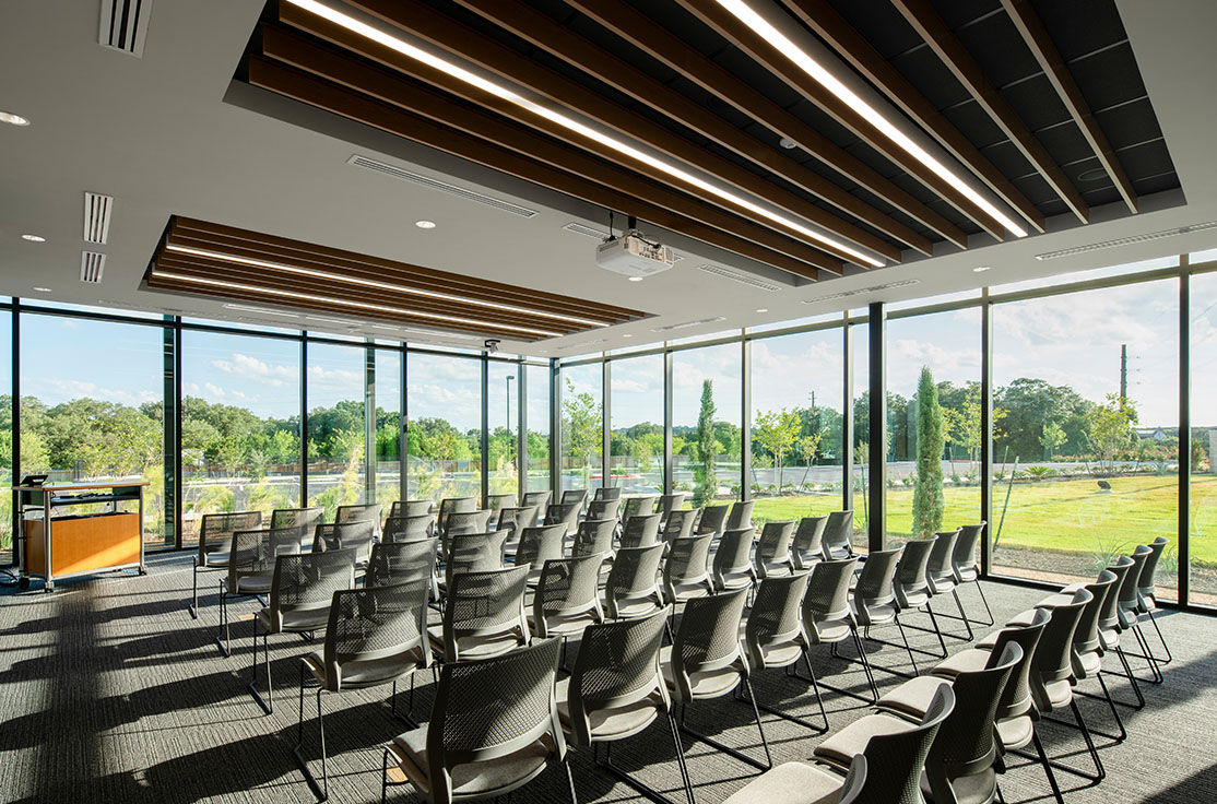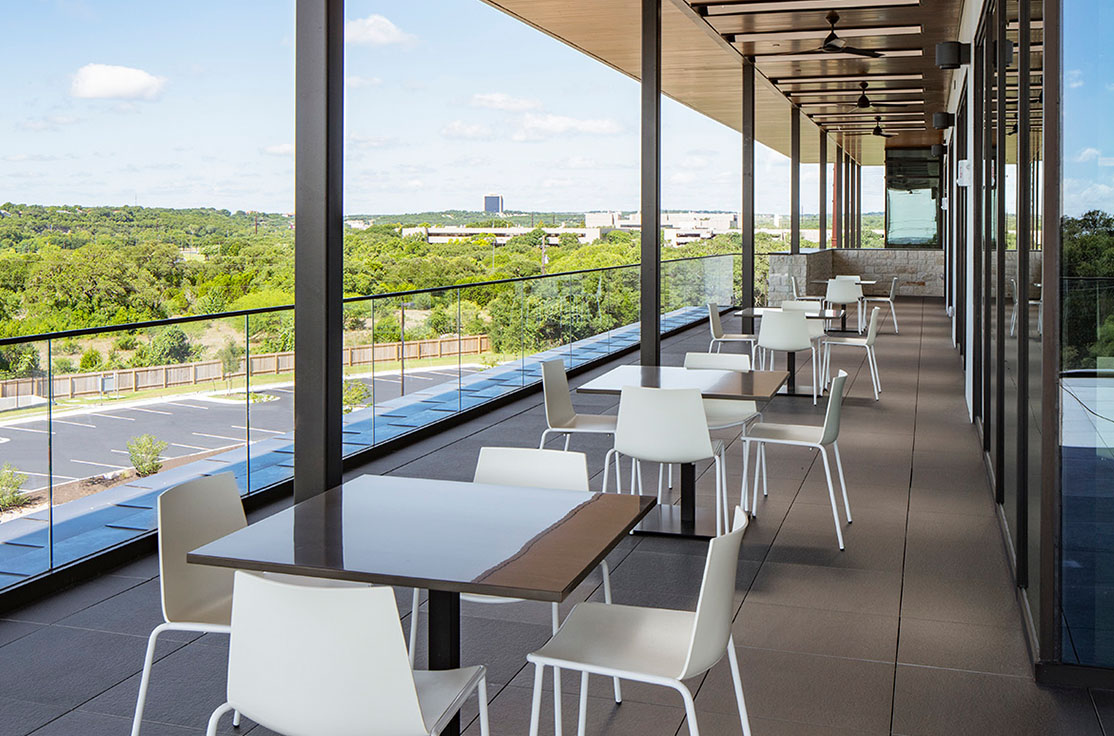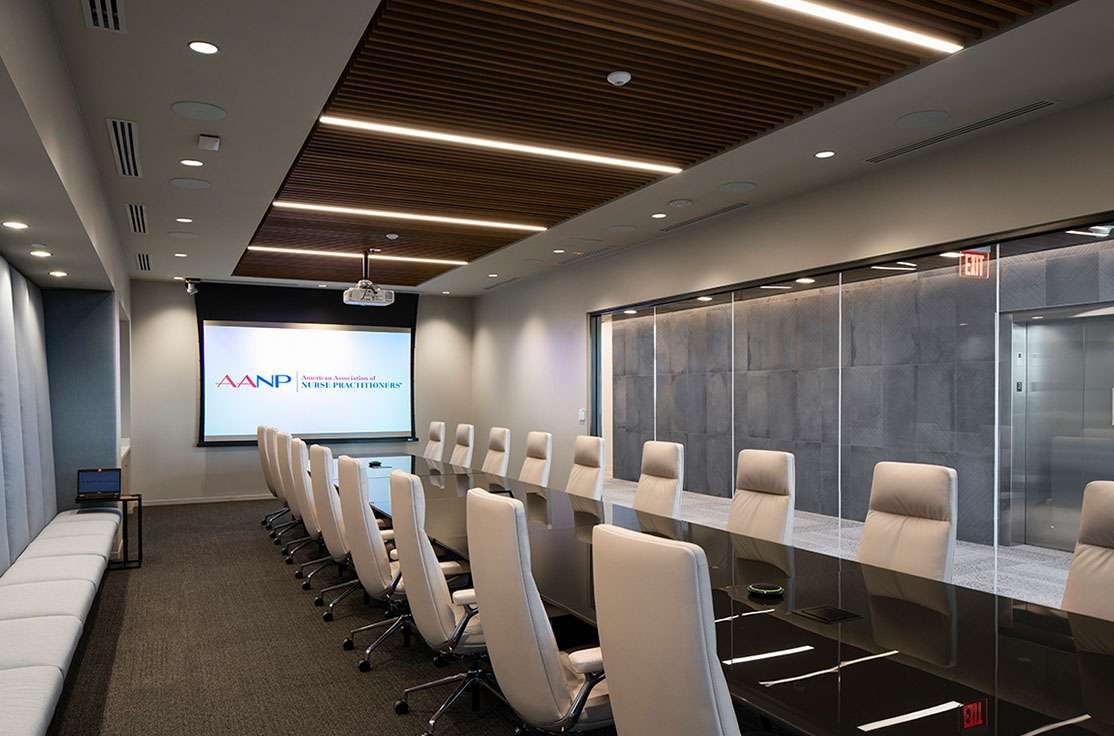 AANP new headquarters building is Class-A office space within a 3-story building on 5 acres in southwest Austin, Texas. The design is intended to bring outside in by use of floor to ceiling windows, soaring views, and incorporation of natural materials.