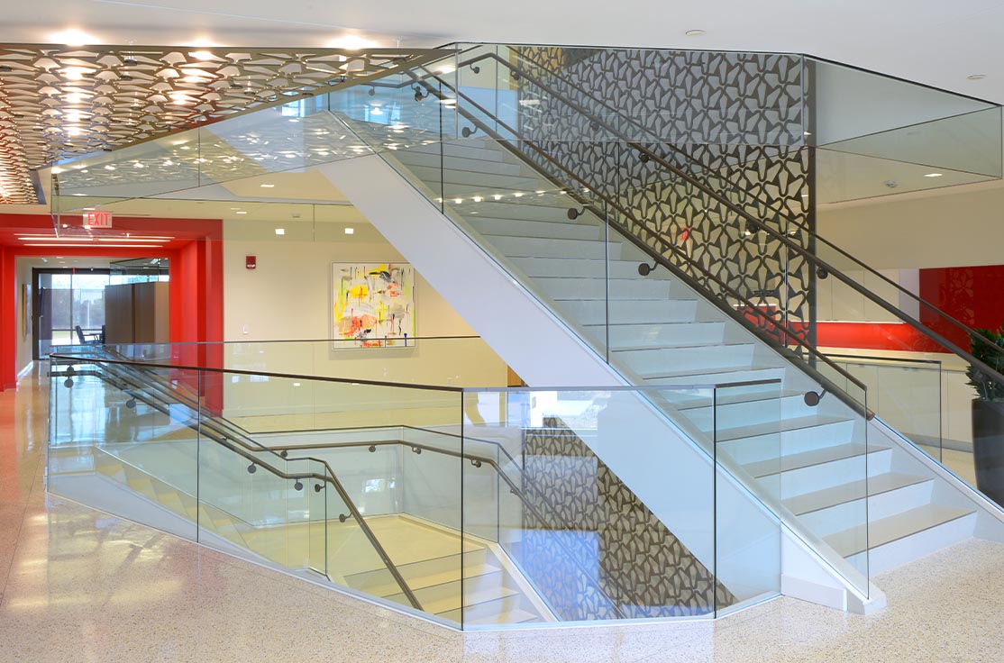 The project encompassed the third, fourth, and fifth floors of Jackson’s newest developments, “The District.” The most prominent feature is a spectacular three-story monumental staircase, fitted with custom glass handrails. It is accentuated with a custom fabricated “Magnolia Screen” spanning all three floors and punctuated with dramatic accent lighting. Attorney offices are enclosed by custom colored butt-glazed aluminum storefront systems with laminated specialty glass. A multipurpose room, equipped with a vertical folding operable glass wall and state-of-the-art audio, visual, and lighting control, features high-end catering kitchens and a café. The schedule was organized in phases to accommodate the owners’ commitment to vacate their existing space.