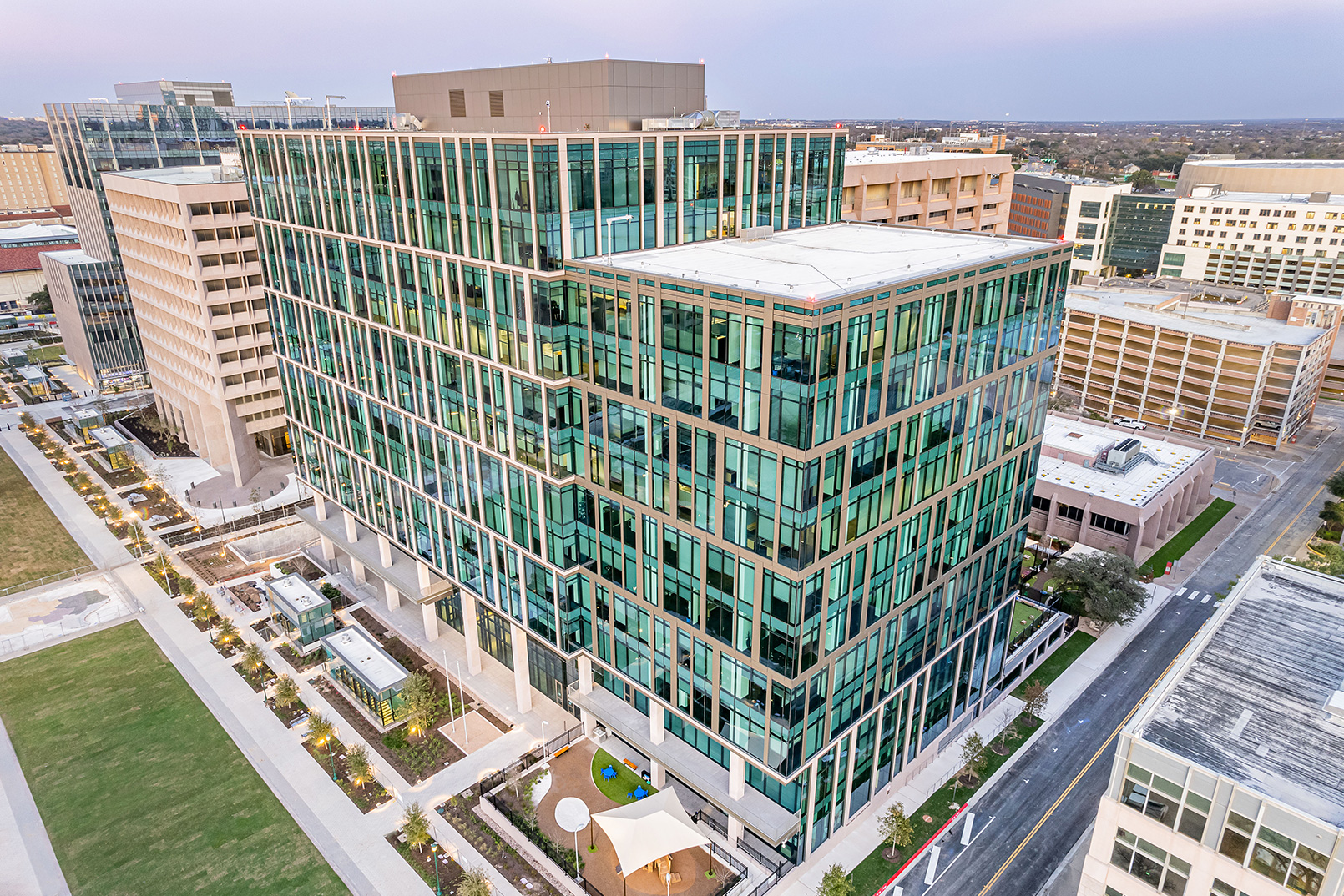 The State of Texas, through its Texas Facilities Commission, has reimagined the capital complex in downtown Austin. Its Master Plan features the state’s iconic pink granite capitol as its anchor and is characterized by grand civic spaces, shaded pedestrian-friendly streets, and connections to the surrounding community. The plan’s first phase includes two new office buildings and five levels of underground parking, which provide a base for a new pedestrian-oriented Texas mall.