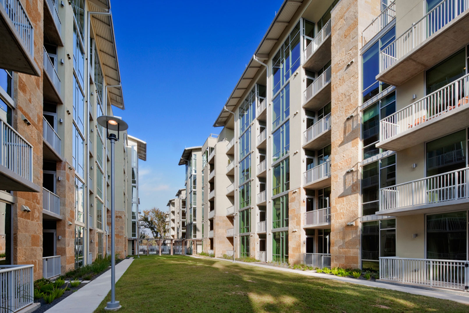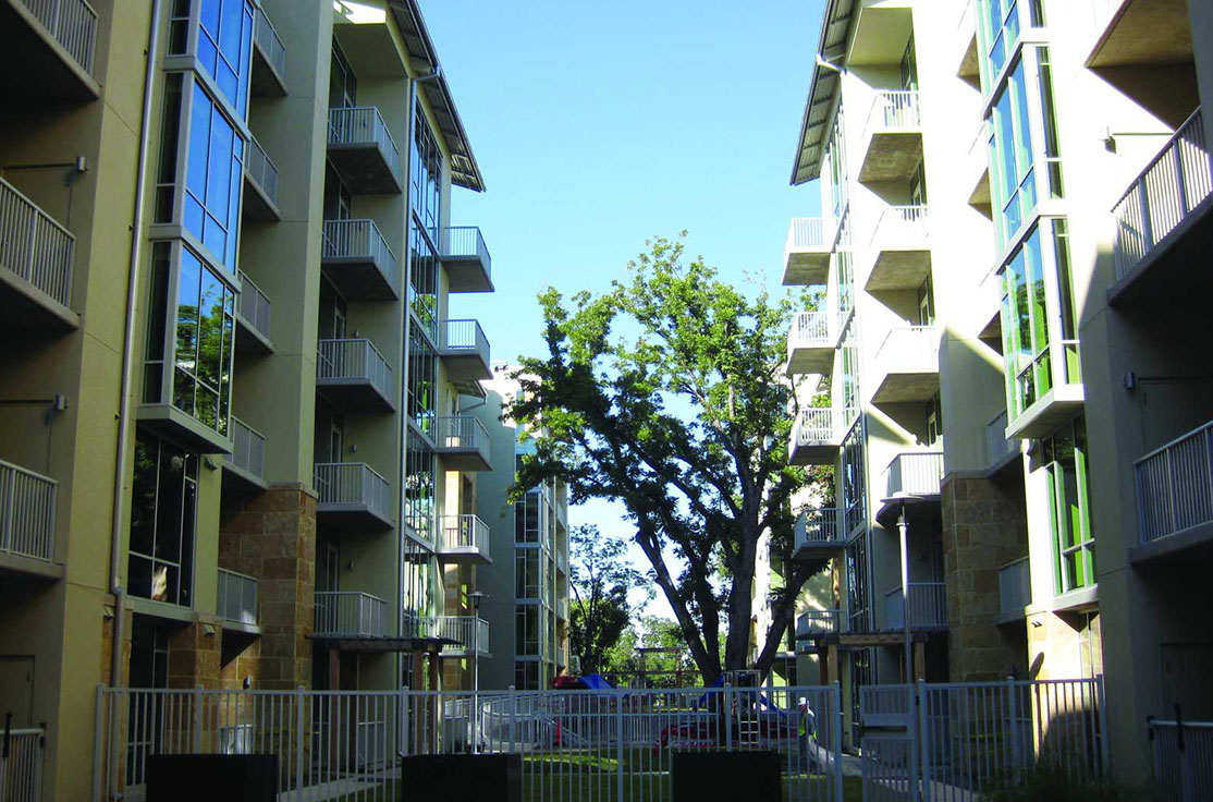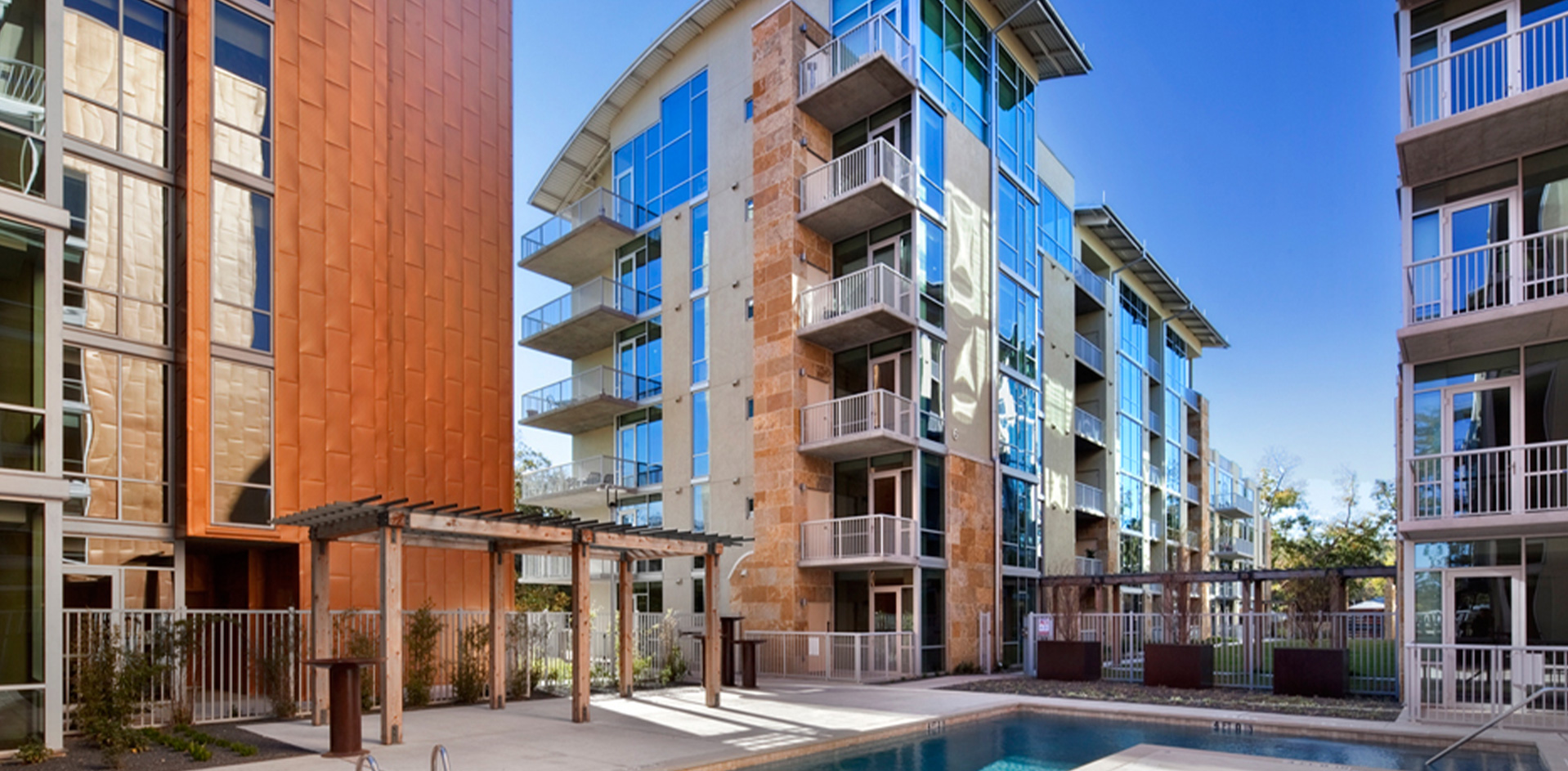 Strategically located in the heart of Austin, the project includes six separate five-story condominium buildings on top of a two-level underground parking garage. The 270 living units include one-, two- and three-bedroom configurations. The exterior façade consists of glass curtainwall, punctuated with natural stone, stucco and metal panel veneers. The roof areas are accented with western red cedar canopies and standing seam barrel roofs. A relaxing central courtyard with swimming pool, cabana and open lawns divide the property longitudinally.