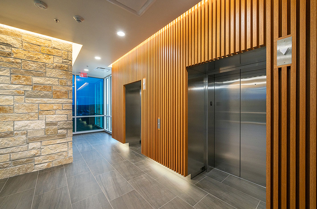 The five-story office building and parking garage core-shell structure has 32,473 sf of office space on two levels and 41,003 sf of parking in three levels below. The building features a stone veneer façade and electrochromic glass windows to automatically tint to maximize natural light, reduce heat and glare, and provide unobstructed views of one of the most beautiful areas of Austin.