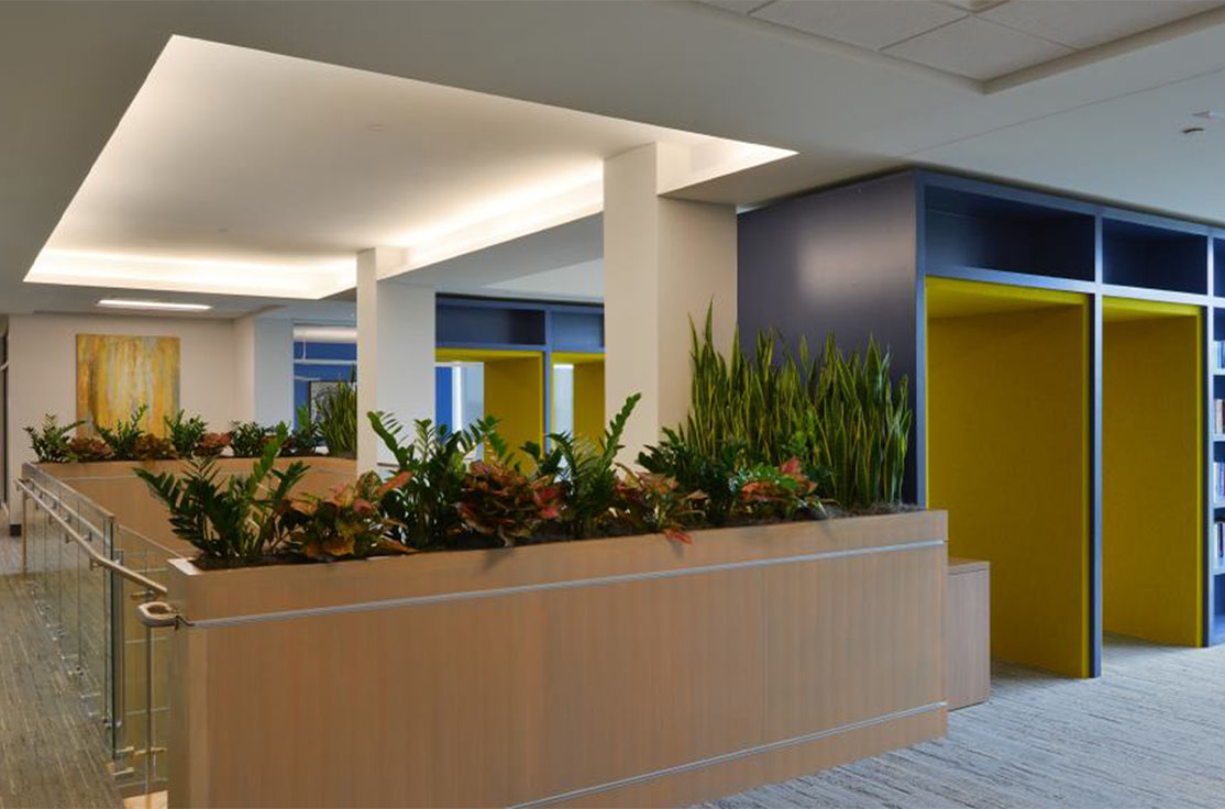 The third-floor interiors were completed as a separate project one year later, incorporating 4,483 sf of glass front offices, a cubicle area, collaboration spaces, and podcast sound in a workroom.