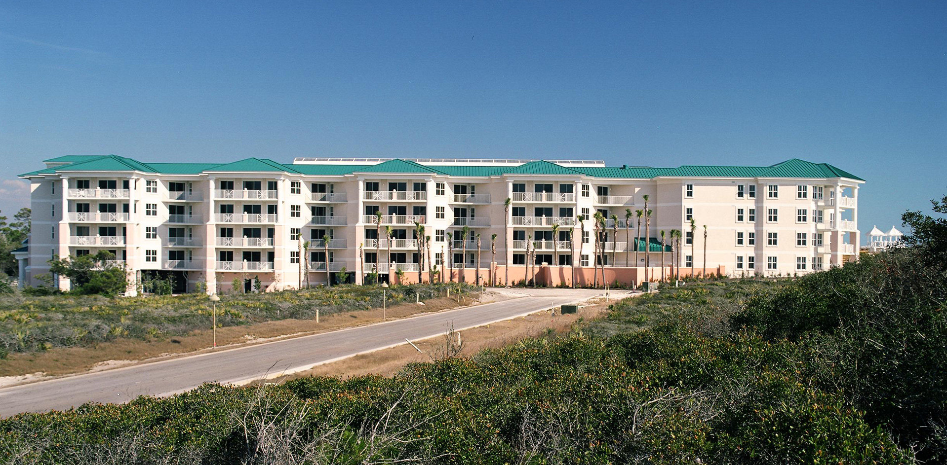 White Construction Company’s early involvement, comprehensive preconstruction services, and rigorous adherence to schedule paid off on this project, as we came in $130,000 under the guaranteed maximum-cost budget. We had to make every inch count, because the building footprint took up almost all of the property. We had only 16 feet to work with on two sides of the 116’ x 375’ structure, and a narrow access point adjacent to protected wetlands. The 48-unit condominium on the Gulf of Mexico has on-grade parking and features a striking four-story atrium that runs through the center of the structure.