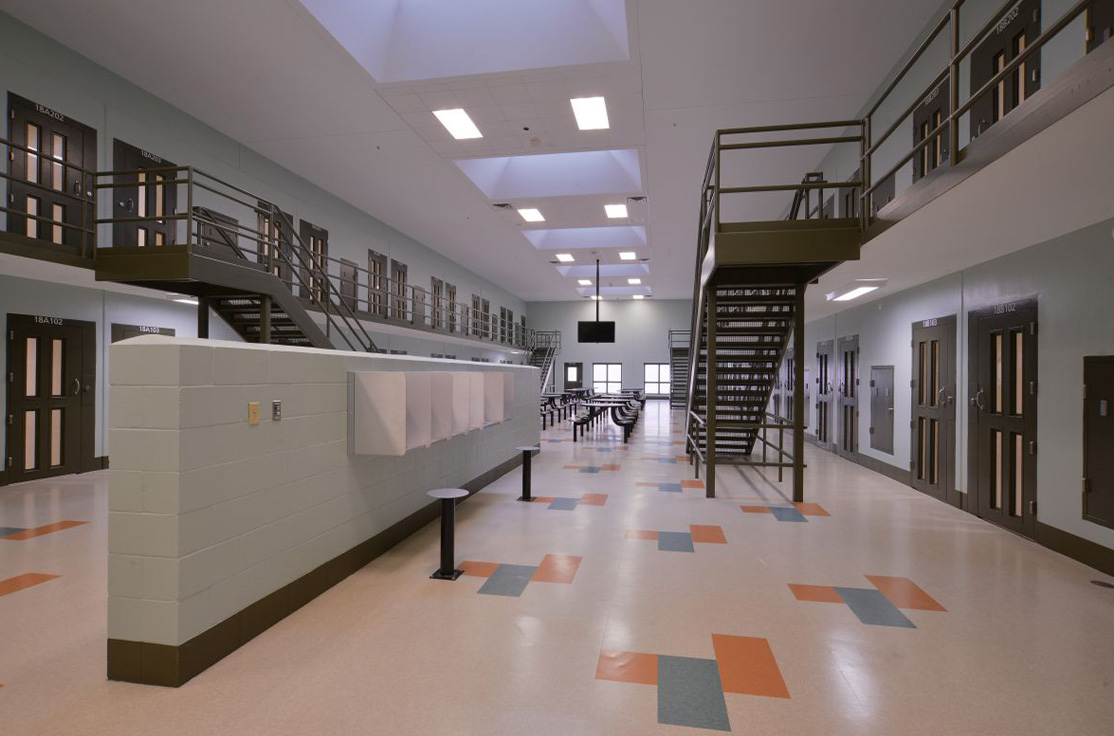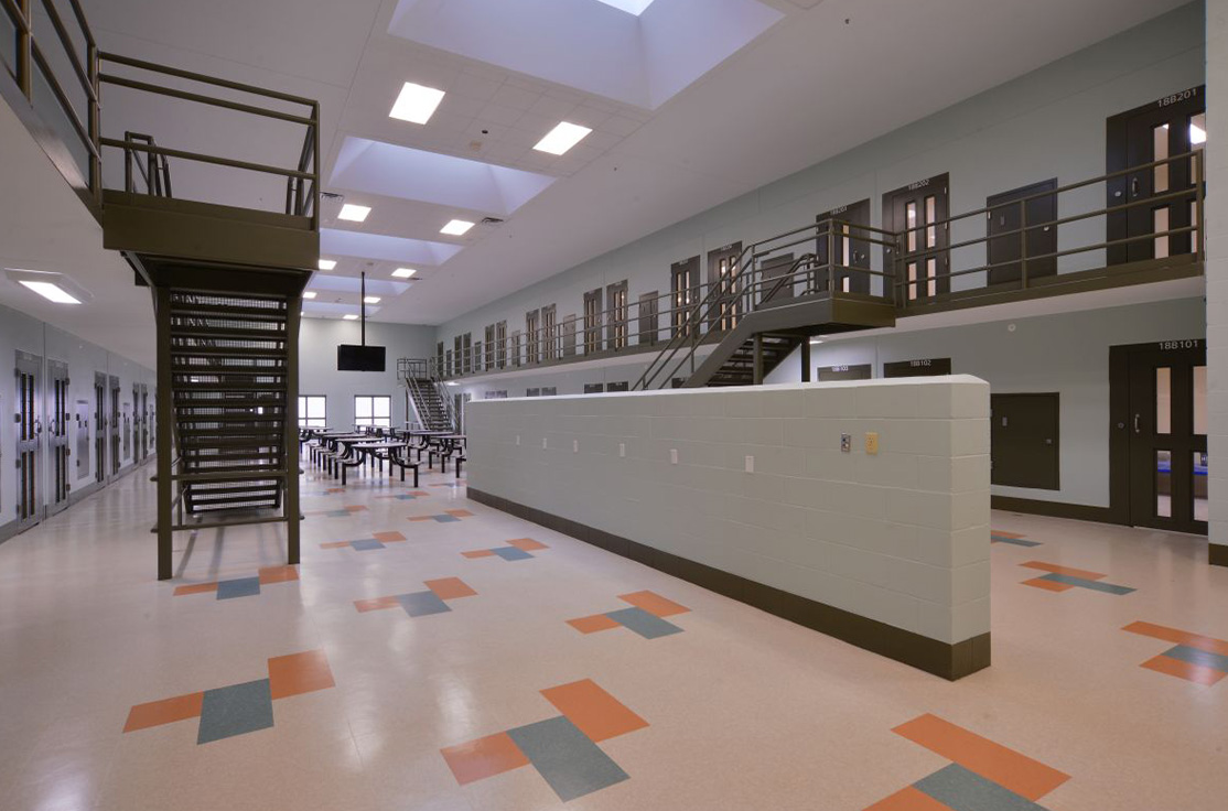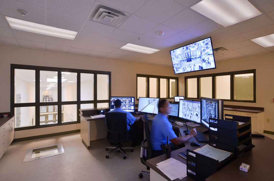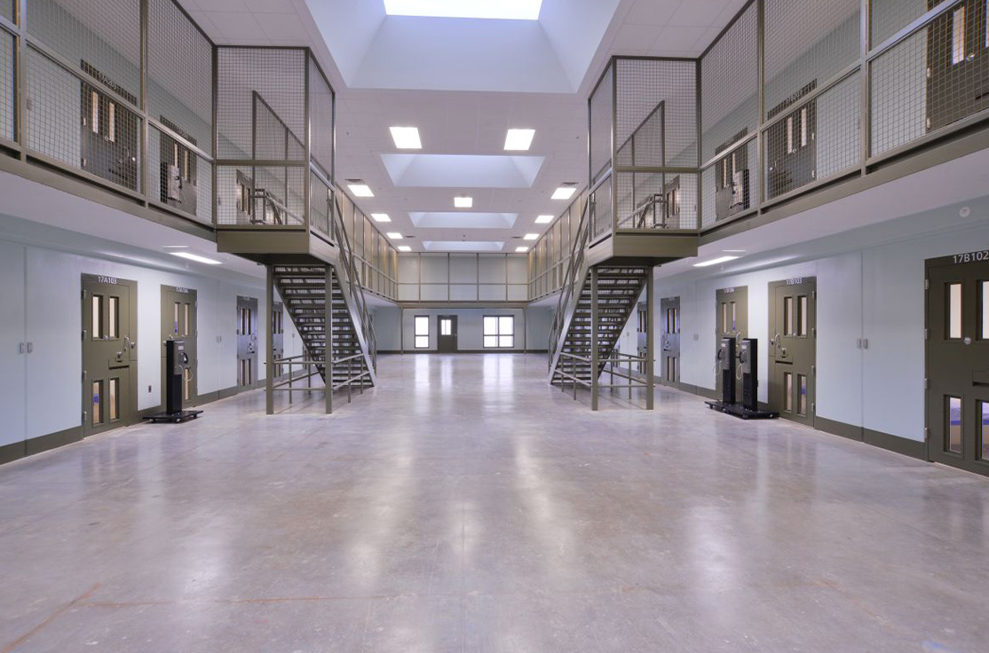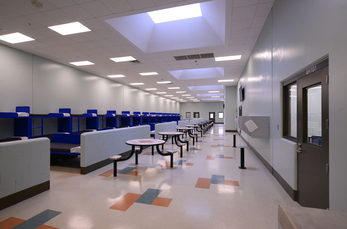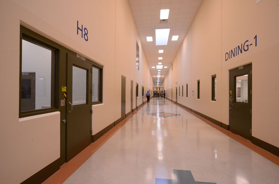 The facility includes male and female-segregated cell units, sixteen dormitory units, five elevators, dining areas, a kitchen, large walk-in coolers, freezers, dry storage rooms, medical, dental, and pharmacy areas, intake/removal processing stations, staff training rooms, command center, muster room, large office areas, and central electrical/mechanical room. In addition, multiple remote mechanical and electrical rooms are strategically located throughout the facility, including security control rooms.