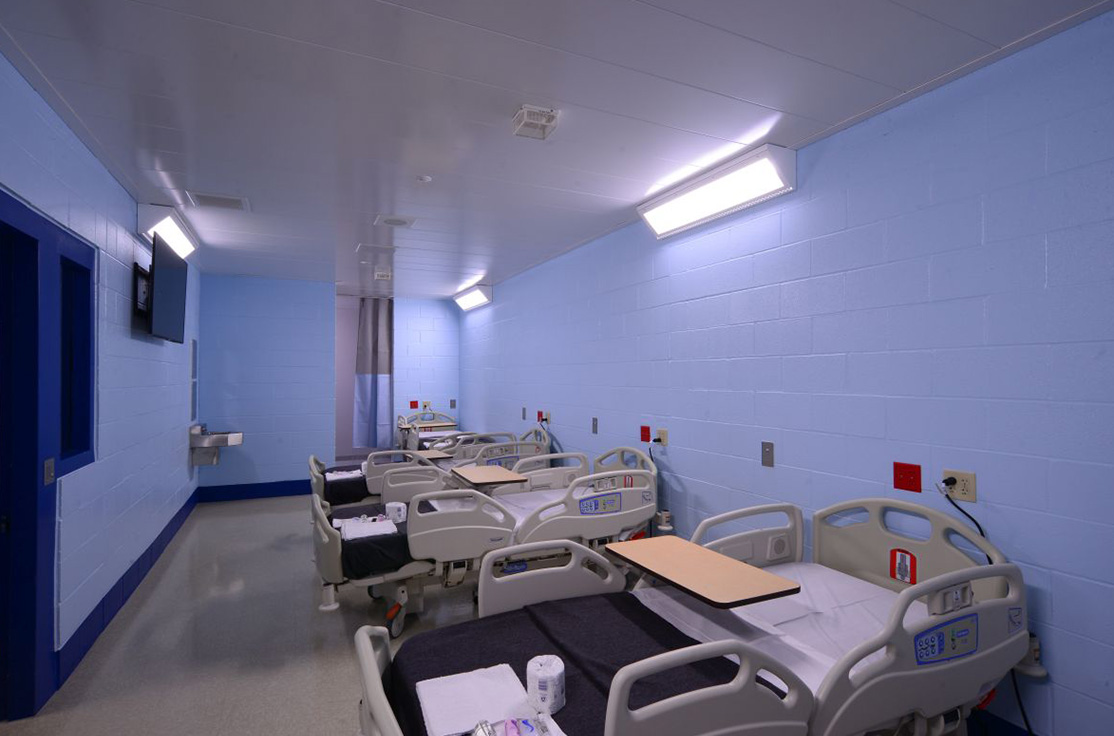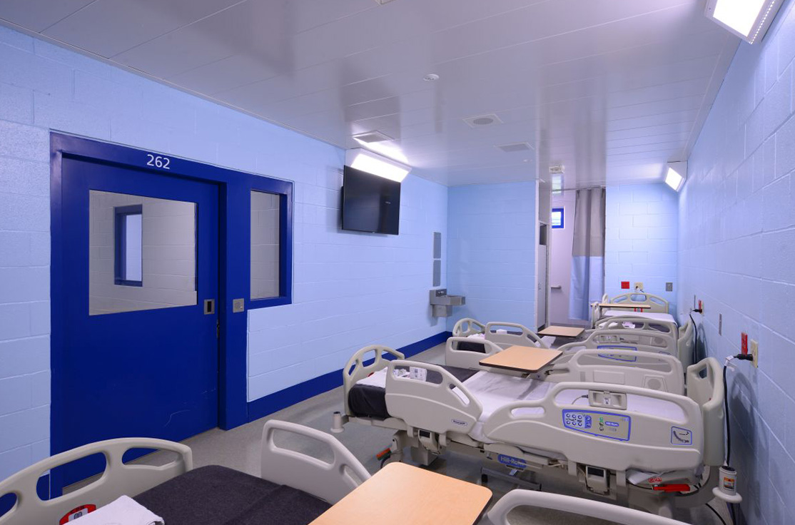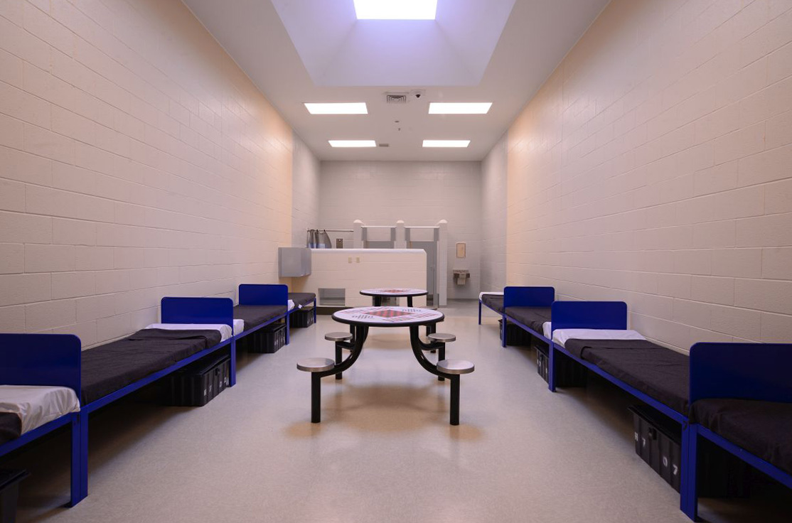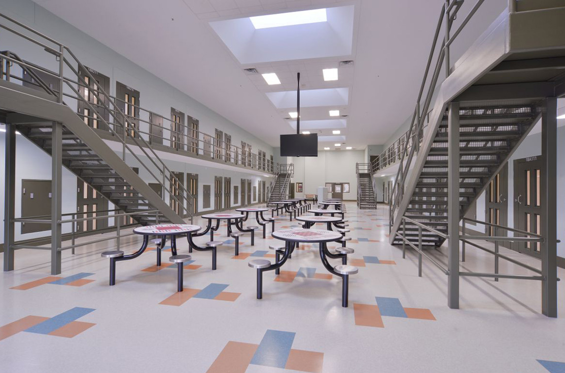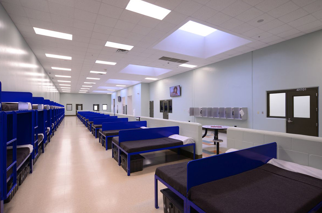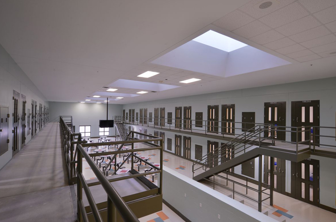 The facility includes male and female-segregated cell units, sixteen dormitory units, five elevators, dining areas, a kitchen, large walk-in coolers, freezers, dry storage rooms, medical, dental, and pharmacy areas, intake/removal processing stations, staff training rooms, command center, muster room, large office areas, and central electrical/mechanical room. In addition, multiple remote mechanical and electrical rooms are strategically located throughout the facility, including security control rooms.