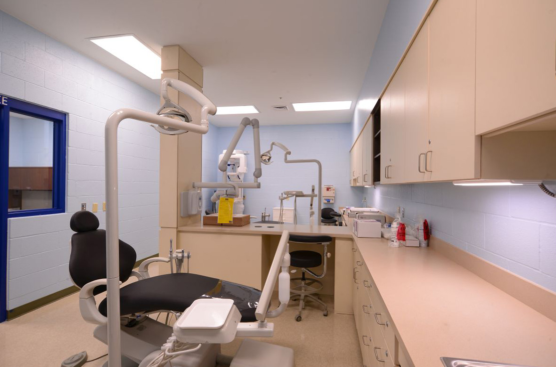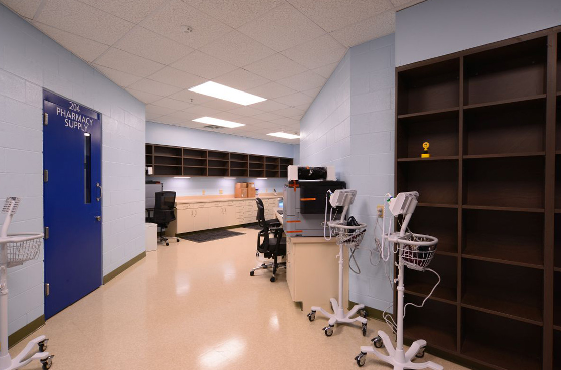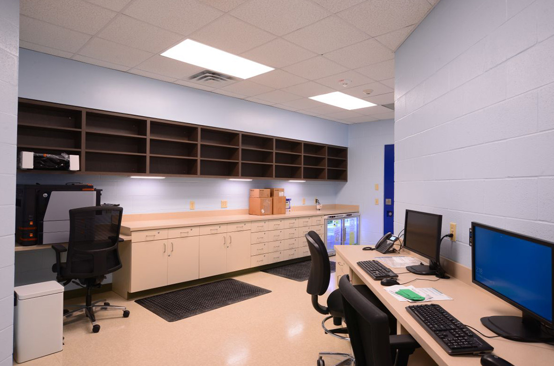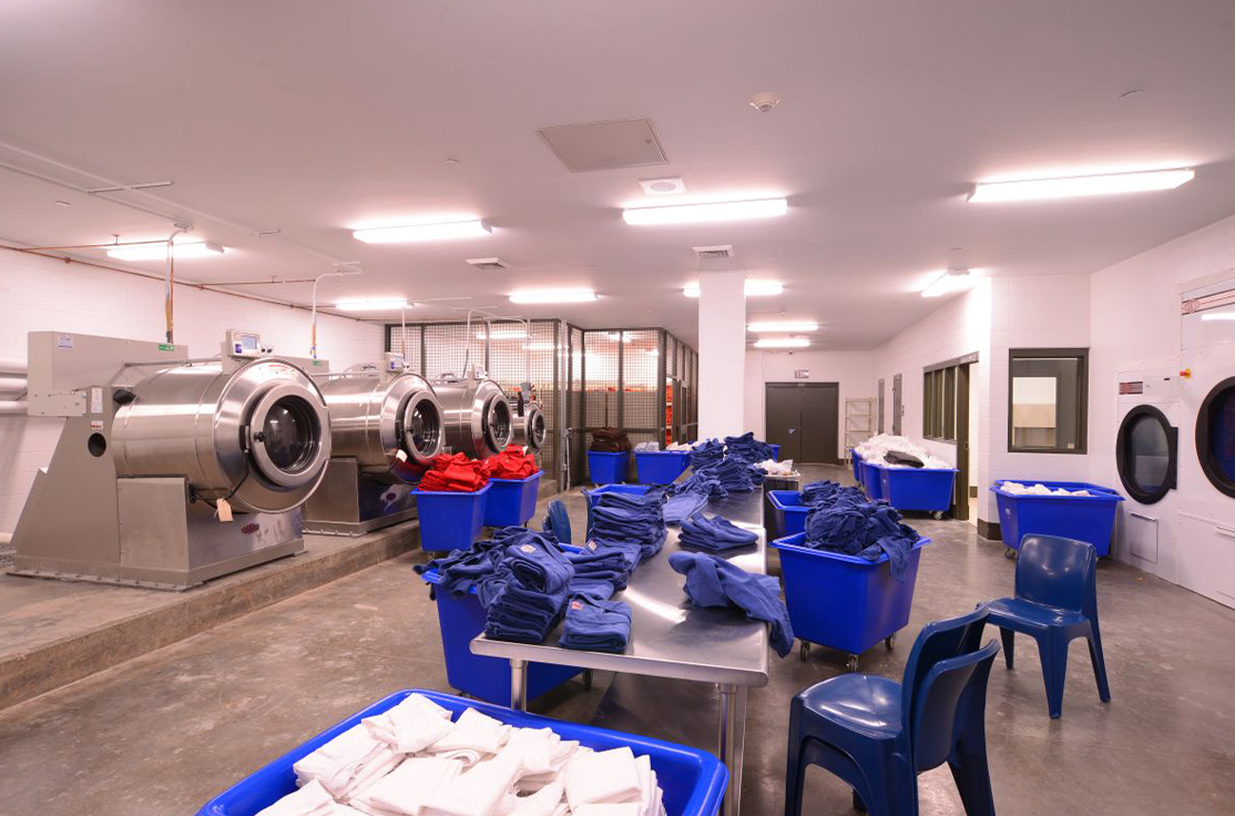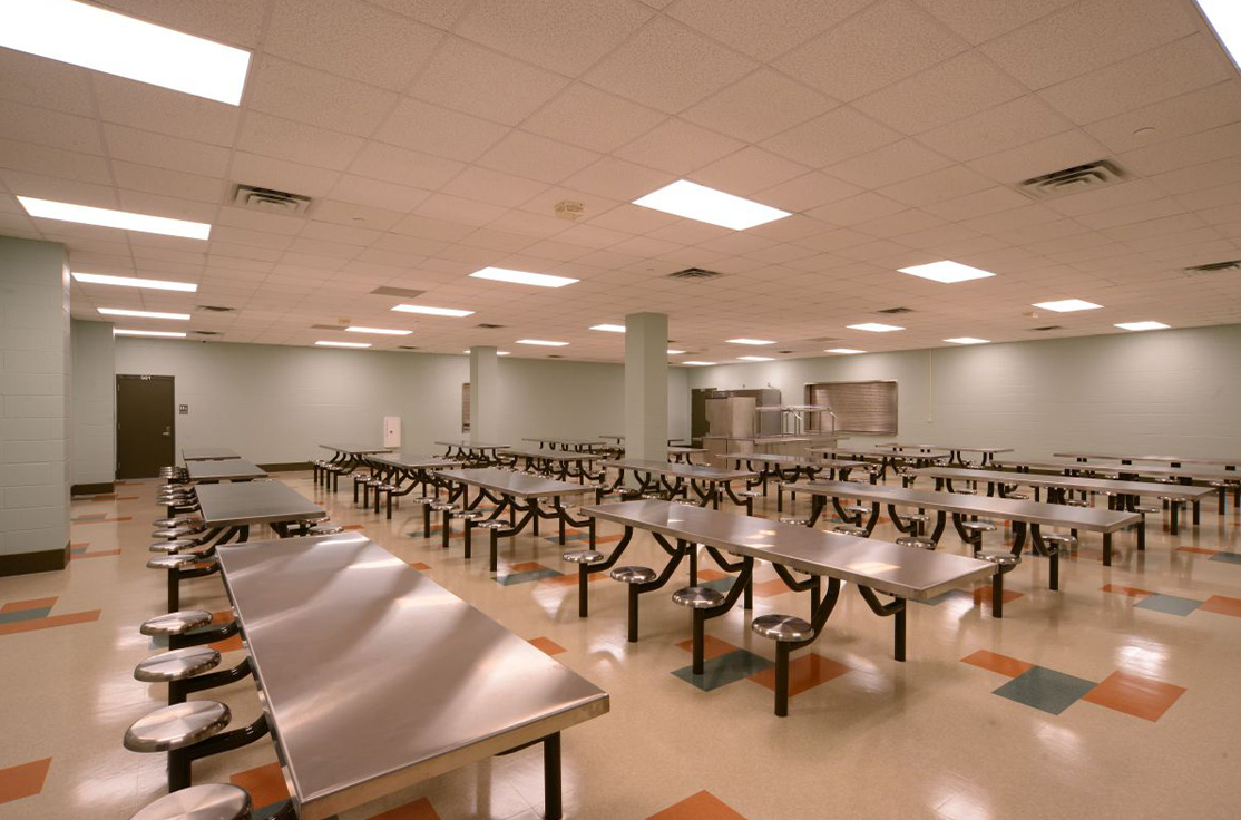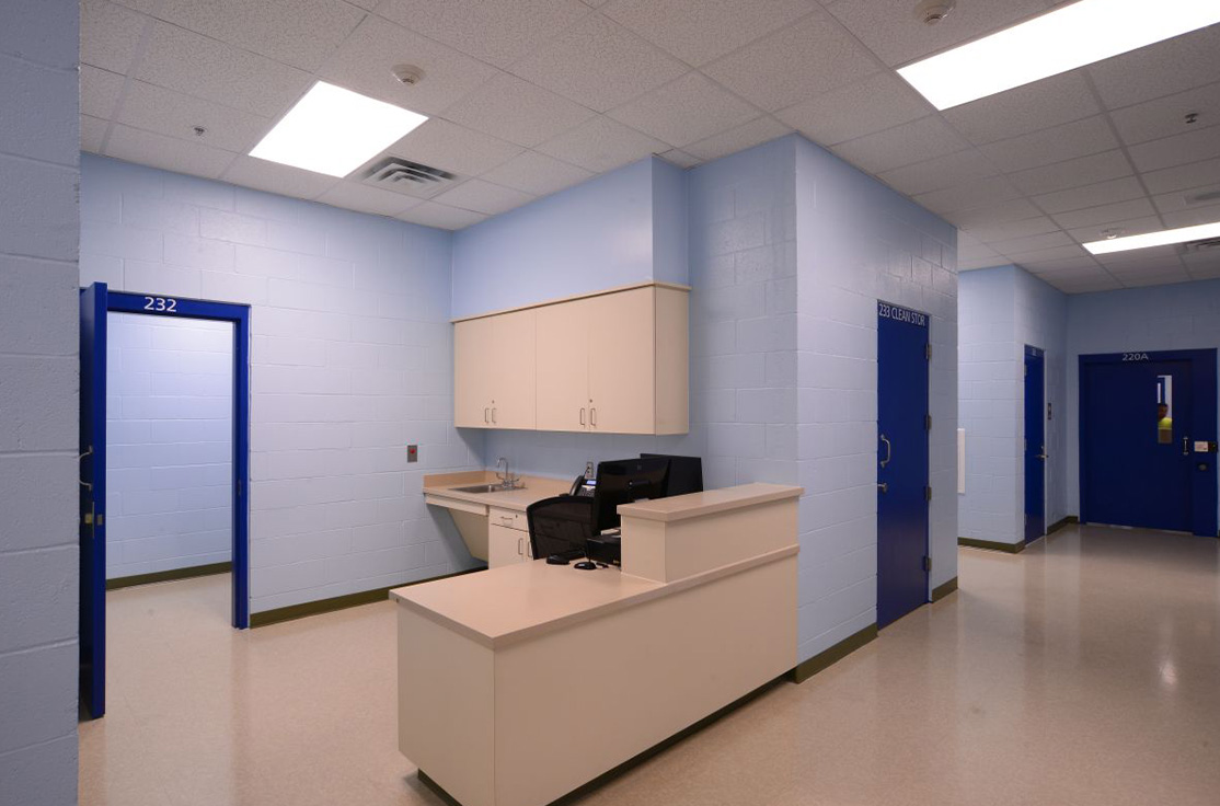 The facility includes male and female-segregated cell units, sixteen dormitory units, five elevators, dining areas, a kitchen, large walk-in coolers, freezers, dry storage rooms, medical, dental, and pharmacy areas, intake/removal processing stations, staff training rooms, command center, muster room, large office areas, and central electrical/mechanical room. In addition, multiple remote mechanical and electrical rooms are strategically located throughout the facility, including security control rooms.