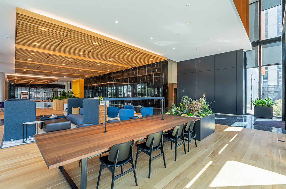 The building includes a state-of-the-art conference center, fitness facilities, multiple outdoor terraces, secured bike storage, and EV charging stations. Supporting 1,525 cars, the integrated parking garage reinforces connectivity between office and retail components. Site improvements included significant utilities relocation and infrastructure modernization to prepare the former IBM site for long-term urban redevelopment. The project earned LEED Silver and AEGB One-Star certifications.